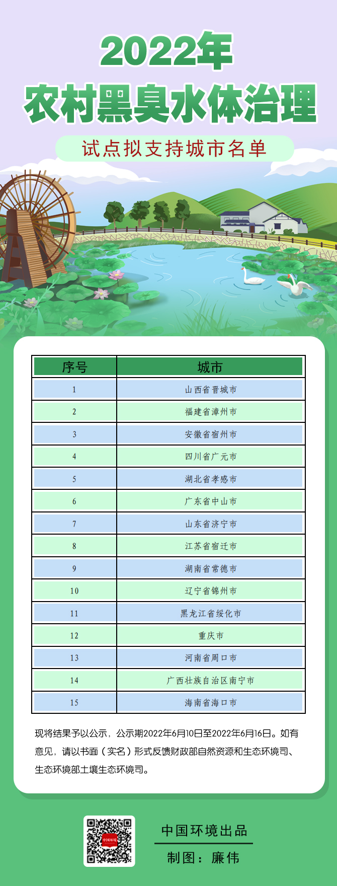 根據(jù)競爭性評審結(jié)果,財政部、生態(tài)環(huán)境部擬將15個城市確定為2022年支持的農(nóng)村黑臭水體治理試點城市,2022年6月10日至2022年6月16日為公示期。期間如有意見,請以書面(實名)形式反饋財政部自然資源和生態(tài)環(huán)境司、生態(tài)環(huán)境部土壤生態(tài)環(huán)境司。