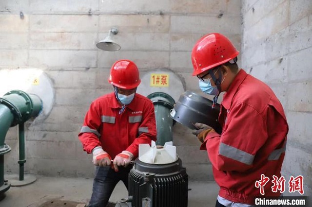 圖為邢臺市城市排水防澇工作人員檢修排水泵。(資料圖) 河北省住房和城鄉建設廳供圖
