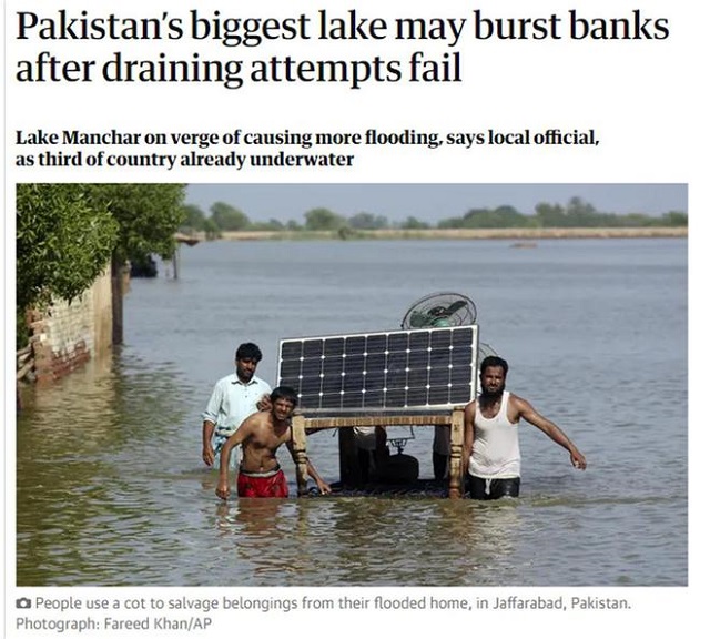 報道稱,為避免造成更大損害,政府官員們已于周日(當(dāng)?shù)貢r間9月4日)對曼查爾湖采取泄洪措施。他們表示,雖然此舉可能會使10萬人被迫離開家園,但同時也會讓人口更稠密的地區(qū)免遭洪水侵襲。