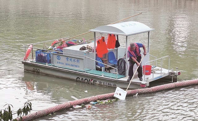 河道保潔員在打撈被漂浮物攔截設(shè)施攔下的河面垃圾。