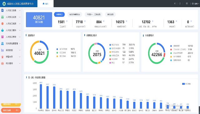 PC端的“成都市入河排口信息管理平臺”則主要用于后臺信息管理,包括數據審核、統計分析、問題調度等,面向各級行政管理人員和數據審核人員。除記錄排口信息、周邊環境、水質水量等數據外,還能利用大數據平臺實現排污口信息的整體呈現和入河排污口“一張圖”管理,便于分區域、分類別整治排污口,因口施策。