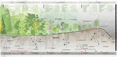 董珂等人在獲獎(jiǎng)作品中采用的是植物修復(fù)的技術(shù)修復(fù)“棕地”土壤,即利用高效累積植物的生長(zhǎng)活動(dòng),將土壤污染物吸收轉(zhuǎn)移進(jìn)入植物體,然后對(duì)植物進(jìn)行收割和處理,從而實(shí)現(xiàn)修復(fù)污染土壤的目的。而這種“修復(fù)”,則體現(xiàn)了“城市雙修”的理念。
