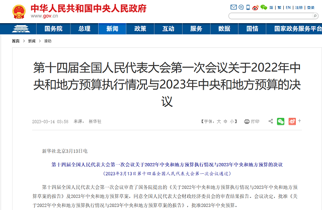 2023年3月13日,第十四屆全國人民代表大會第一次會議審查了國務(wù)院提出的《關(guān)于2022年中央和地方預(yù)算執(zhí)行情況與2023年中央和地方預(yù)算草案的報告》及2023年中央和地方預(yù)算草案,同意全國人民代表大會財政經(jīng)濟委員會的審查結(jié)果報告。會議決定,批準(zhǔn)《關(guān)于2022年中央和地方預(yù)算執(zhí)行情況與2023年中央和地方預(yù)算草案的報告》,批準(zhǔn)2023年中央預(yù)算。
