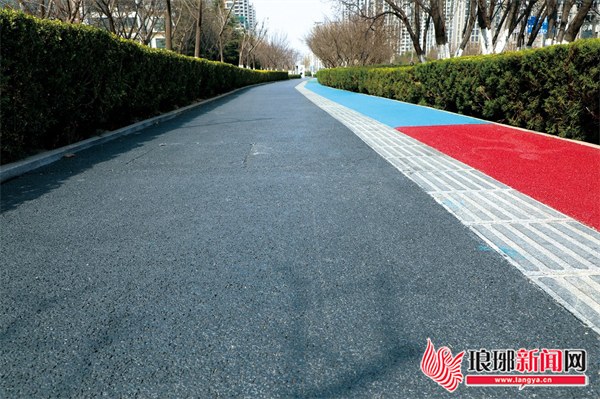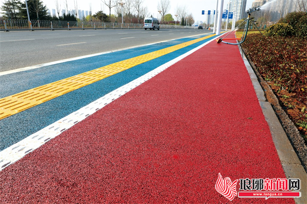 武漢路(蒙河路-沂蒙路)人行道改造工程全長400米,寬3米,面積1200平方米。工程采用透水混凝土工藝進(jìn)行鋪設(shè),結(jié)構(gòu)層為10厘米透水混凝土基層加5厘米彩色透水混凝土面層,有效提高城市道路的雨水滲透能力、高散熱性能和景觀功能。