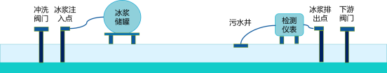 冰漿清洗技術(shù)是將冰漿加注進管道內(nèi),使冰漿在管道內(nèi)形成一段柔軟的“冰活塞”,再利用市政管道上游水壓推動“冰活塞”向前移動,在移動時冰漿與管道內(nèi)壁發(fā)生碰撞及摩擦,使管底沉積物與管壁附著物的穩(wěn)定結(jié)構(gòu)遭到破壞,從而剝離管壁并隨著冰漿一起向前移動直至排出管道,最終達到清洗管道的目的。