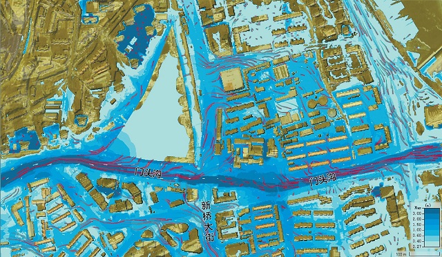 以受災較嚴重的門頭溝和中門寺溝兩個流域為例,8月1日雨勢減小后,工作組即刻到山洪沖擊地區(qū)進行現(xiàn)場調(diào)研,收集實地洪水排泄及淹沒資料;8月4日開始搭建洪水反演模擬模型,經(jīng)過近20次的驗證調(diào)試,模擬結(jié)果基本符合實際。經(jīng)過驗證的模型,可以模擬不同降雨條件下洪水和城市內(nèi)澇的淹沒情況,為災后恢復重建、長遠高質(zhì)量發(fā)展提供決策支持。