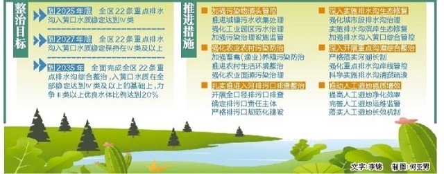 方案明確,2023年底前,完成全區22條重點排水溝補充排查,摸清各類排污口的分布及數量、污水排放特征及去向、排污單位基本情況等信息,強化基礎排查和源頭管控。各地級市政府按照“依法取締一批、清理合并一批、規范整治一批”要求,嚴格落實排污口設置審批有關規定,建立排污口整治銷號制度,開展排污口規范化建設。