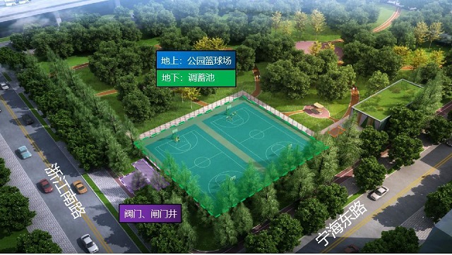 新延安東提標調蓄池位于黃浦區延福公園西南角的籃球場下方,總占地面積2926.9平方米。通過打造一座“綠色”提標調蓄池,并結合后期少量的管道翻排,能夠將系統內排水能力由一年一遇提升至五年一遇,暴雨天啟用調蓄池后可有效提高系統的防澇能力,確保地區的防汛安全。同時,項目結合公園籃球場建設,通過服務周邊居民,打造環境改善、休閑活動、城市形象多元化功能體系,實現中心城土地集約化開發利用,為中心城區綠色調蓄設施的布局建設作出了良好的示范。