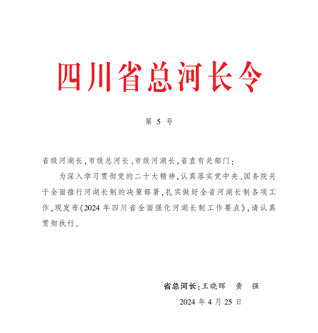 為深入貫徹落實黨中央、國務院和省委、省政府全面推行河湖長制的決策部署,根據《四川省全面落實河長制工作方案》(川委辦發電〔2017〕12號)《關于全面落實湖長制的實施意見》(川委辦〔2018〕33號)工作安排,持續強化全省河湖長制,加強區域協同、流域統籌,系統推進河湖管理保護和治理,不斷改善全省河湖面貌。現結合我省實際,制定2024年度工作要點。