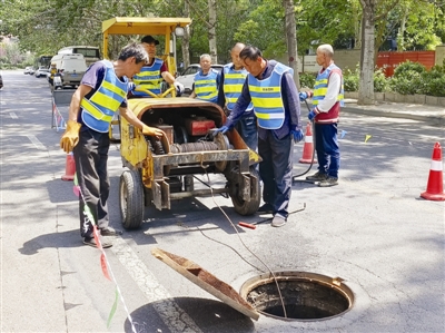 圖為排水工人加緊對雨水管道、污水管道進(jìn)行疏通。