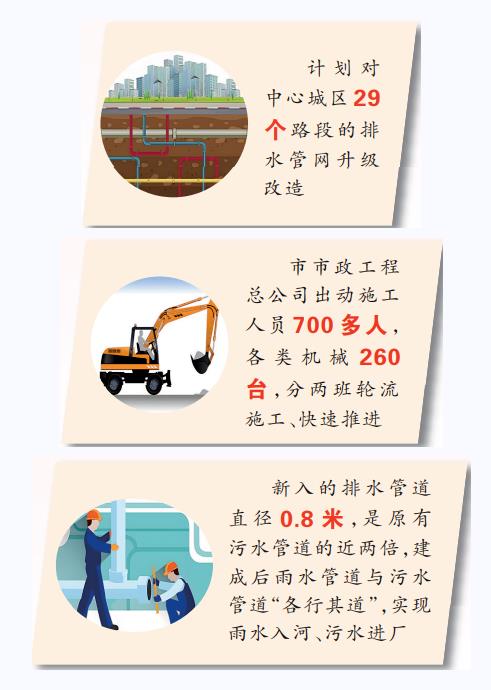 一個個項目相繼完工,深埋于城市地下的“毛細血管”逐漸發達。目前,我市已完成七一路(車站路至文化路段)、建設路(人民路至明山路段)等8個路段的排水防澇施工改造。正在對北京大道、武侯路、工業路、車站路等13個路段進行施工,這13個路段全部為雨污水未分流路段。通過本次施工改造,將進一步優化排水系統,有效提升中心城區排水防澇能力,減輕雨天污水處理廠壓力。