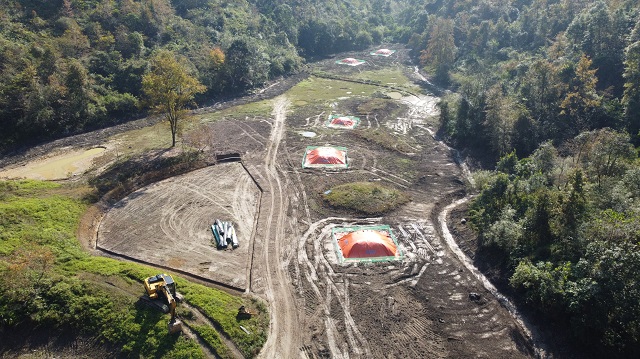 圖為河池市生態(tài)環(huán)境局指導(dǎo)項(xiàng)目實(shí)施方對(duì)三鏡巖溶洼地開(kāi)展進(jìn)場(chǎng)道路修建。