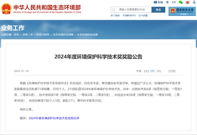 環境保護科學技術獎 該獎項是由生態環境部主管的國家環保領域最高獎項,旨在獎勵在環境保護科學技術活動中做出突出貢獻的單位和個人,調動廣大環??茖W技術工作者的積極性和創造性,促進環??萍际聵I發展,其科學性、公正性和權威性得到社會各界的廣泛重視和支持。