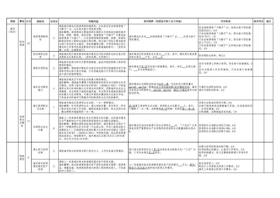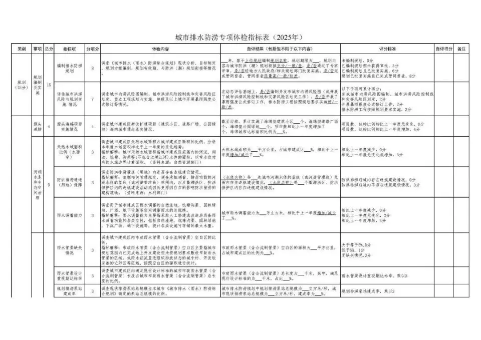 為深入貫徹落實(shí)黨中央、國(guó)務(wù)院決策部署,建立城市內(nèi)澇治理評(píng)估機(jī)制,我們?cè)?024年組織開展城市排水防澇專項(xiàng)體檢自評(píng)估的基礎(chǔ)上,研究更新了《城市排水防澇專項(xiàng)體檢指標(biāo)表(2025年)》(見附件,以下簡(jiǎn)稱“指標(biāo)表”),現(xiàn)印發(fā)給你們。請(qǐng)你們結(jié)合2025年汛前準(zhǔn)備、隱患排查等工作,組織開展城市排水防澇專項(xiàng)體檢自評(píng)估,全面排查城市防洪排澇體系的問題短板和薄弱環(huán)節(jié)。專項(xiàng)體檢要覆蓋全部城市(包括地級(jí)及以上城市、縣級(jí)市,不含下轄縣、鄉(xiāng)、鎮(zhèn))。針對(duì)體檢發(fā)現(xiàn)的問題,屬于本部門的,要明確措施和整改時(shí)限,持續(xù)推進(jìn)解決;需要相關(guān)部門解決的,城市建設(shè)(排水)部門要報(bào)告屬地政府,及時(shí)反饋和移交。