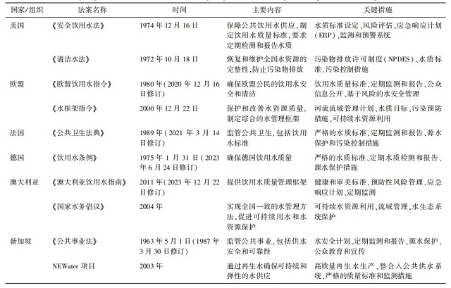 飲用水質量標準 發達國家依托法案法規制定了相應的飲用水質量標準:美國通過《安全飲用水法》設定了多種污染物的限值,顯著提升了水質;法國和德國依托《歐盟飲用水指令》,制定了高標準的水質限值,并通過嚴格的監測和管理措施,確保水質安全;澳大利亞依據《澳大利亞飲用水指南》,采用預防性風險管理和定期監測措施,提升自來水質量;新加坡根據WHO的指導,制定了嚴格的水質標準,通過NEWater項目和綜合水管理體系,確保高質量的飲用水供應(表4)。