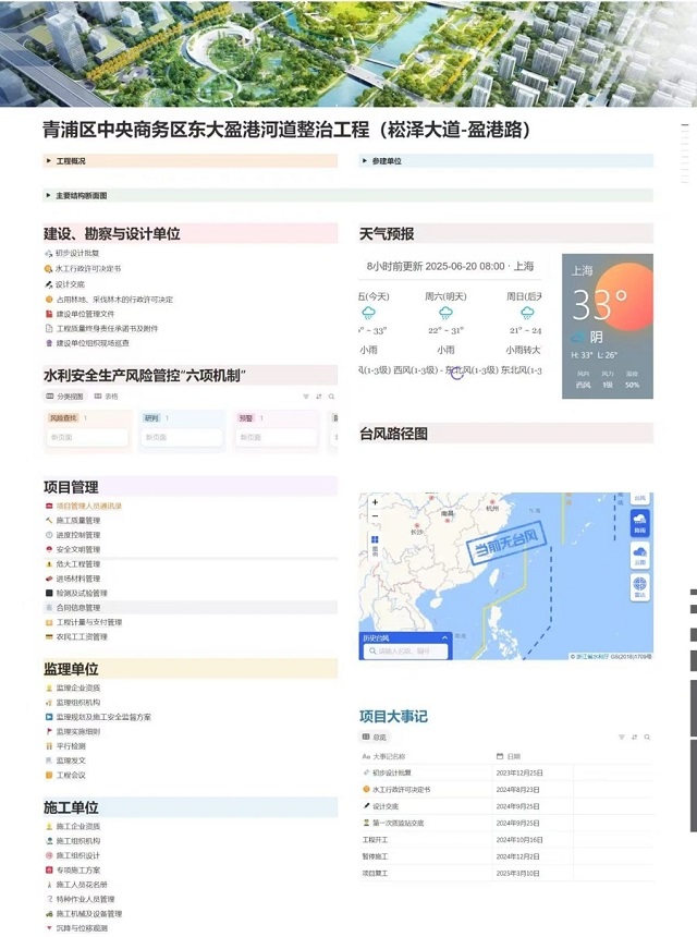 在基坑與閘室結(jié)構(gòu)施工中,項(xiàng)目團(tuán)隊(duì)以“科技興安”理念推動(dòng)安全生產(chǎn)標(biāo)準(zhǔn)化建設(shè),通過3D建模對(duì)施工全流程進(jìn)行全景模擬推演,提前預(yù)判風(fēng)險(xiǎn)點(diǎn)。自主研發(fā)的“項(xiàng)目全流程監(jiān)管系統(tǒng)”基于Notion平臺(tái)構(gòu)建,集成質(zhì)量、安全、進(jìn)度等核心數(shù)據(jù)實(shí)時(shí)監(jiān)控功能,創(chuàng)新嵌入臺(tái)風(fēng)預(yù)警、精準(zhǔn)天氣預(yù)報(bào)及AI大模型風(fēng)險(xiǎn)分析模塊,實(shí)現(xiàn)從隱患排查到應(yīng)急處置的全鏈條數(shù)字化管控。