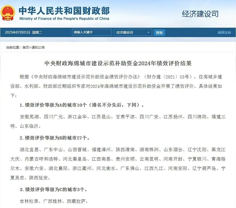 根據(jù)《中央財(cái)政海綿城市建設(shè)示范補(bǔ)助資金績(jī)效評(píng)價(jià)辦法》,住房城鄉(xiāng)建設(shè)部、水利部、財(cái)政部近期組織專家對(duì)2024年海綿城市建設(shè)示范補(bǔ)助資金開(kāi)展了績(jī)效評(píng)價(jià)。具體結(jié)果如下:
