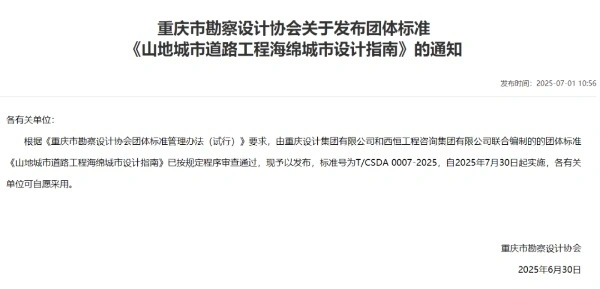 由重慶設計集團有限公司市政設計研究院主編的《山地城市道路工程海綿城市設計指南》于2025年7月30日起實施。主要內(nèi)容涵蓋道路海綿指標的確定、計算方法、設施布局、設施設計及植物配置等關(guān)鍵環(huán)節(jié),并針對當前道路海綿城市建設中存在的海綿指標界定不清、設施計算不規(guī)范、滯留帶收水效率低及植物景觀效果欠佳等問題提出了差異化解決方案,兼具適用性和可操作性。