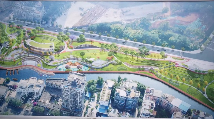該公園占地約3萬平方米,建設(shè)內(nèi)容涵蓋親水碼頭、海綿型公園綠地、慢跑步道、雨水花園、音樂噴泉、親水廣場、淺灘戲水區(qū)等,配套2個城市驛站與1個兒童活動區(qū)。項(xiàng)目自今年1月起打圍施工,目前親水碼頭主體已完工,公園總體施工完成30%。