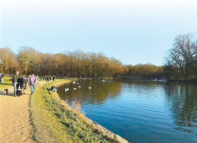 位于布魯塞爾市郊的坎貝爾森林湖兼具蓄洪功能。圖為市民在湖畔散步休閑,盡享愜意時光。