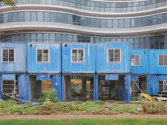 珠海,被臺風“樺加沙”吹壞的工地集裝箱,工地工人在臺風前已撤離。